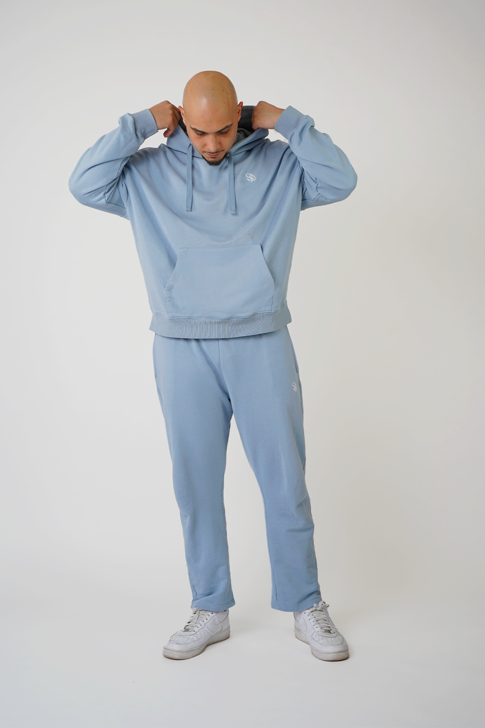 Das Model mit unserem Hoodie in der Farbe Schwarz ist 1,71 Meter groß und trägt die Größe M.